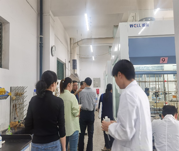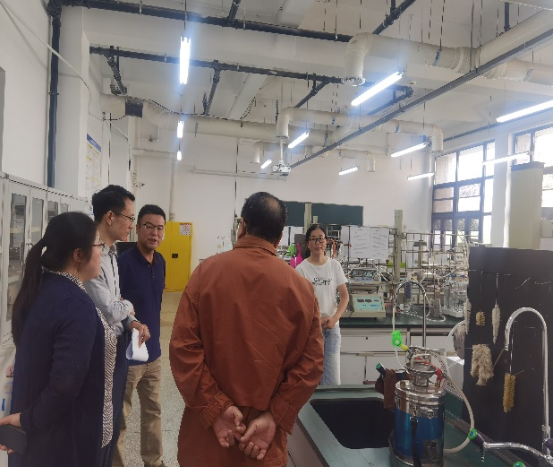 随后周院长一行到化学楼基础化学实验室参观,并进入正在开展实验的应化专业综合实验室查看实验教学实际运行情况,对学院基础化学实验室数量、设备台套数、排课基本情况、教师指导情况进行了解。