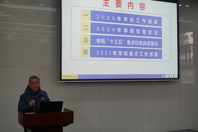 孙涛垒院长首先作学院工作报告,回顾了2020年学院工作,汇报了学院财务状况和学院“十三五”重点任务完成情况,并对2021年学院工作进行展望。