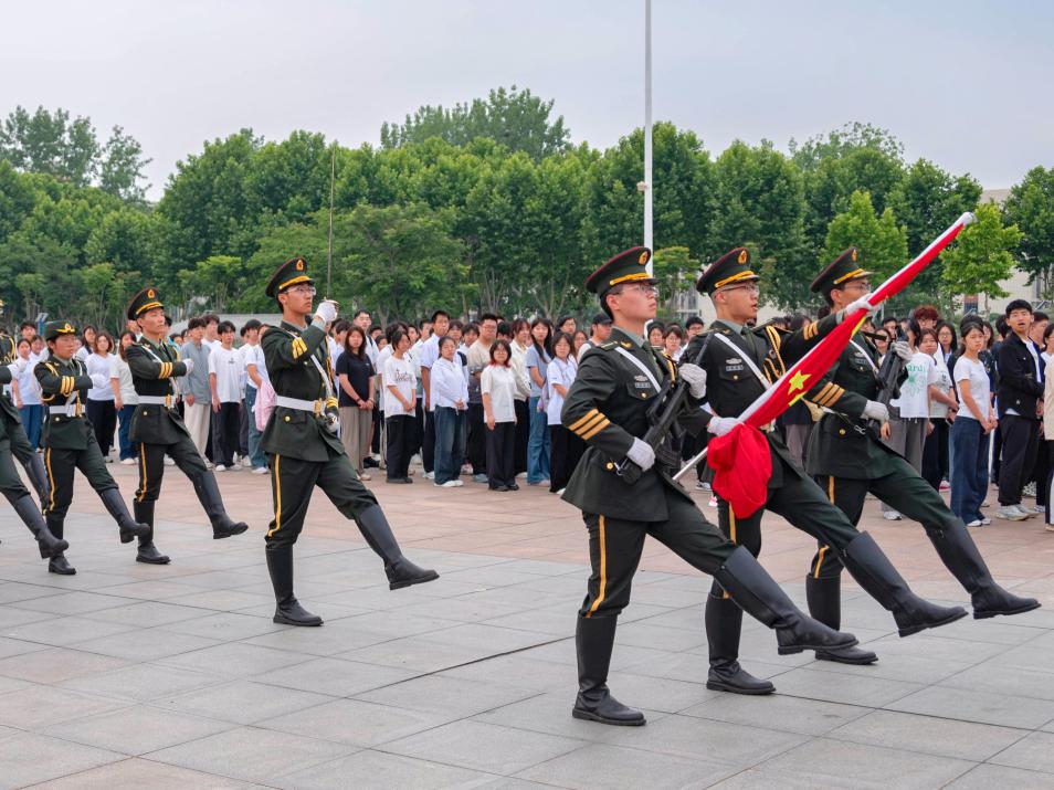 当第一缕金色晨晖浸染天际,校国旗仪仗队戎装笔挺、英姿飒爽,踏着掷地有声的正步,以雷霆之势护卫五星红旗庄严入场。随着《义勇军进行曲》雄浑的旋律响彻苍穹,升旗手利落挥臂间,鲜艳的旗帜如红霞破晓般凌空舒展,在晨风中划出壮美弧线。全体师生列阵如松肃穆凝望,目光如炬齐声高唱,穿云裂石的国歌声激荡在每个人的心间,汇聚成澎湃的赤子热忱。