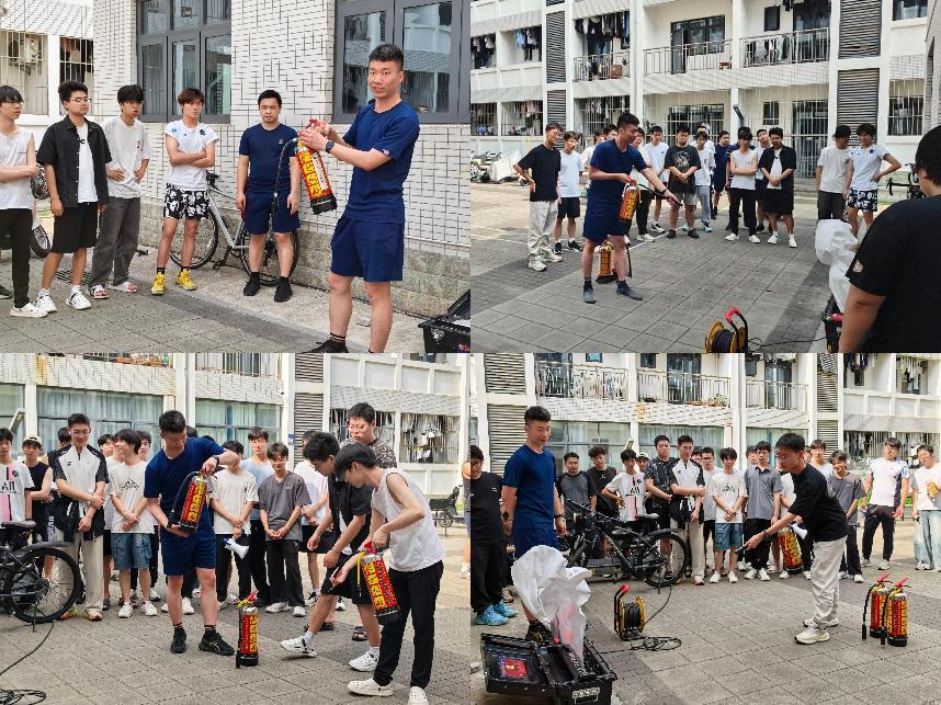 随着模拟警报声急促响起,演练正式启动。在学院辅导员、宿管人员及学校保卫处的引导下,两栋宿舍楼的学生迅速反应,严格遵守“弯腰、低姿、捂口鼻”的要领,沿预定疏散路线有序撤离至楼外开阔安全地带,过程紧张而高效。疏散集结后,专业消防人员随即展开现场教学,系统讲解灭火器“提、拔、握、压”等关键步骤。在专业指导下,众多学生主动上前,争相体验实操灭火器扑灭初起火源,从理论到实践,切实掌握了“救命本领”。