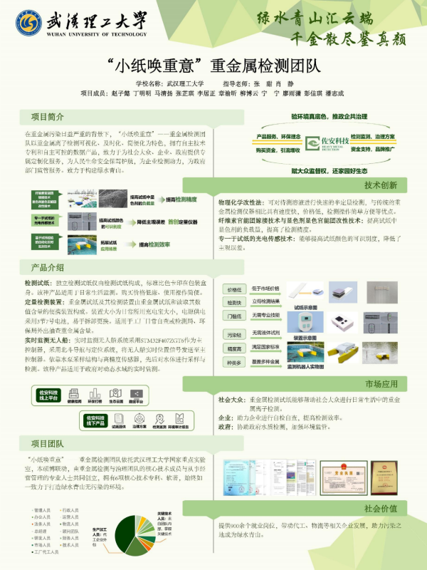 在张甜、肖静老师的指导和国家大学生创新创业项目的支持下,团队成员历经三年攻坚克难,突破现有技术,设计适配重金属离子检测的纤维素结构,实现了水质中重金属离子的快速检测,引领水质快速检测和重金属离子检测技术的发展,助力绿水青山和环境保护。