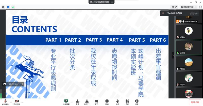 耿英刚副书记在会上介绍了山东省专业平行志愿规则和批次分类、各批次录取的相关规定及近两年学校在山东省招生录取情况,以帮助宣传组人员更好的了解山东省招生政策和录取情况。