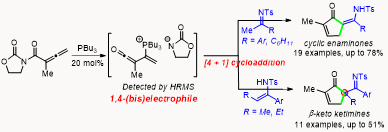 黄毅勇教授课题组还基于目前亚胺与联烯之间的亲核性催化反应体系只涉及两性离子反应中间体的研究现状,突破现有反应模式,创新性的提出用噁唑烷酮衍生的联烯酰亚胺代替联烯基酯,在叔膦催化剂作用下生成手性双亲电性中间体,最终实现首例联烯与亚胺、烯胺和酰胺之间的[4 + 1]环加成反应,分别构建了全取代烯胺酮、含全碳手性中心的β-酮亚胺及γ-内酰胺等重要骨架分子,将为发展一系列联烯酰亚胺与不同类型双亲核试剂的不对称[4 + n]环加成反应及一些天然产物的简洁合成奠定重要基础。论文同样发表在化学领域顶级期刊《Angew. Chem. Int. Ed. 2019, ASAP, DOI: 10.1002/anie.201912263》,第一作者为硕士研究生曹泽混,黄毅勇教授为唯一通讯作者。