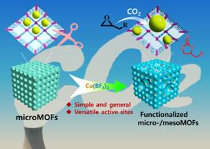 金属-有机框架材料(Metal-Organic Frameworks, MOFs)是由有机配体与金属原子或原子簇以配位键相连接,自组装形成的具有周期性网络结构的类沸石材料。由于具有超高的比表面和孔隙率、灵活的骨架结构可设计性等特点,MOFs材料在气体吸附、分离、非均相催化等领域显示出巨大的应用前景。然而,尽管MOFs材料的种类众多,但是目前报道的绝大多数MOFs材料以微孔为主(< 2 nm),其微孔内高的分子扩散阻力严重影响了其在许多领域的应用。此外,其功能化活性位点也有待进一步丰富,拓展其功能化应用,特别是在非均相催化领域。