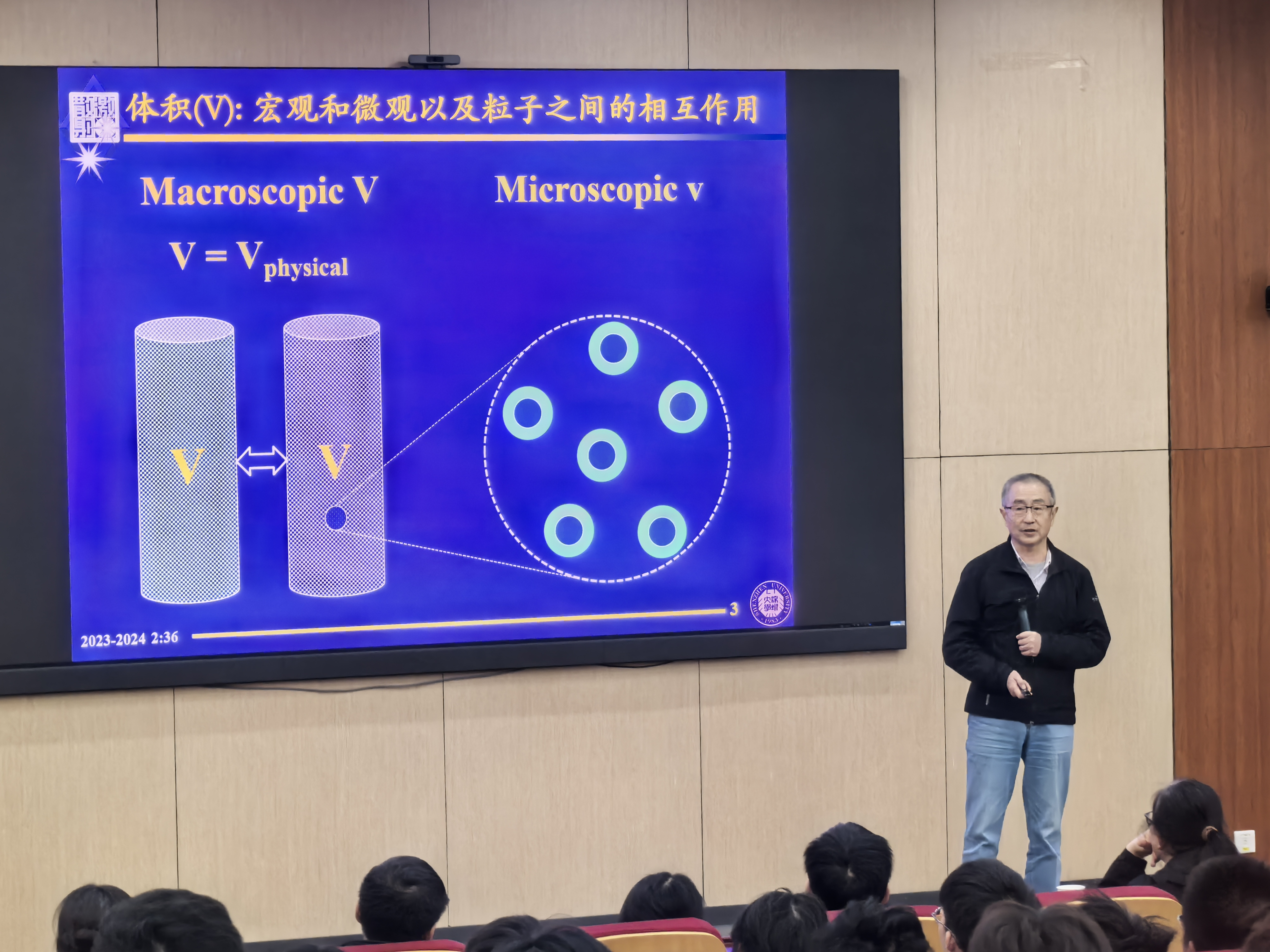 在报告环节,吴奇院士以“压强的本质”为起点,严谨而生动地演绎了从理想气体方程到液体渗透压与固体模量的理论拓展,深入浅出地剖析了热力学原理的物理本质。他通过列举生活和研究实例,生动论证了热力学原理的应用价值,强调研究成果应实现从“书架”到“货架”的转化,深刻点明了科学研究的终极使命。最后,吴奇院士回顾了自身的科研历程,与在场师生交流了研学与做人的深刻体悟。吴奇院士真诚勉励青年学子扎根基础、潜心钻研,致力于开展富有价值的创新研究,并殷切期盼他们未来能为国家科技事业的蓬勃发展贡献力量。
