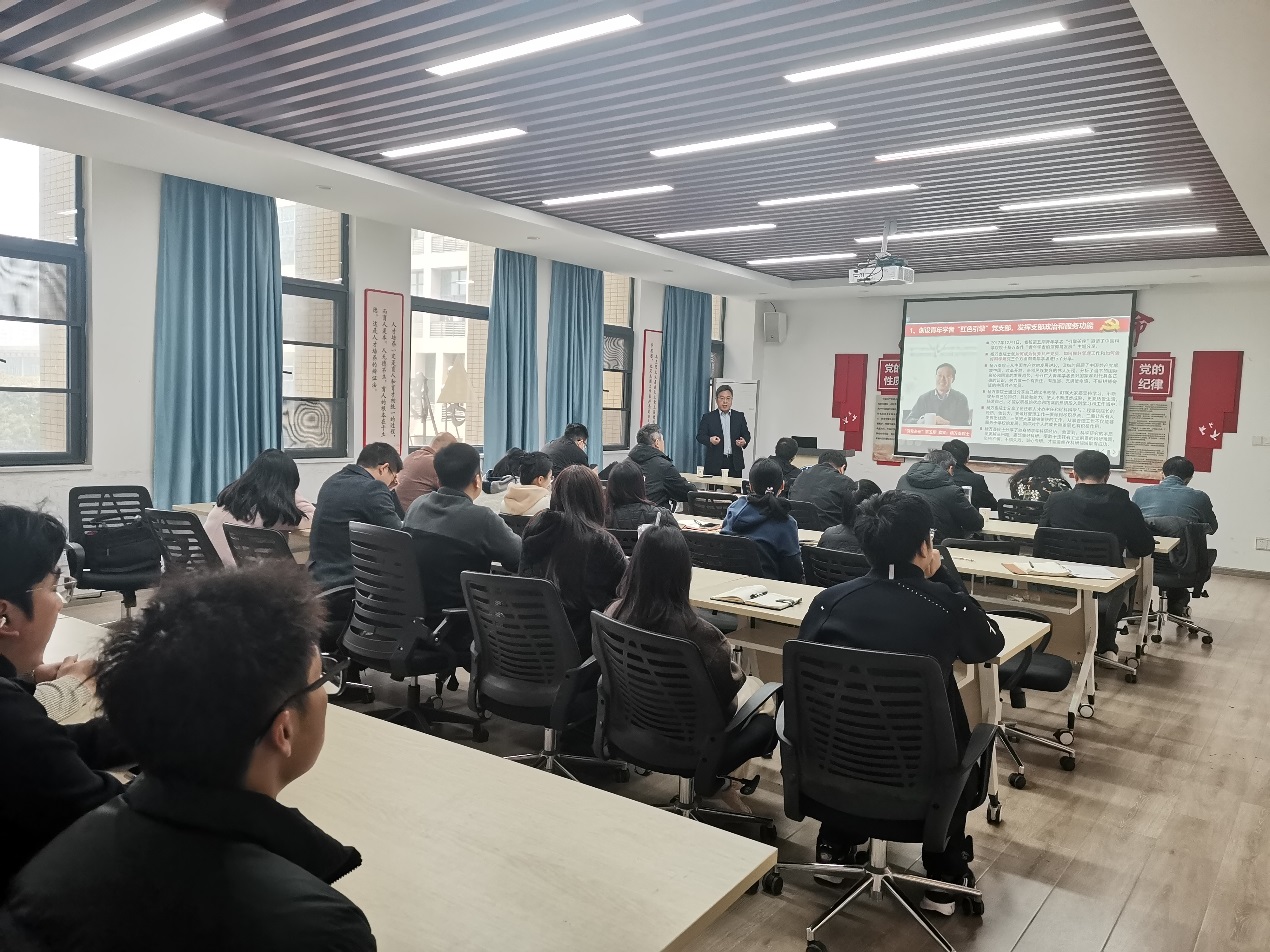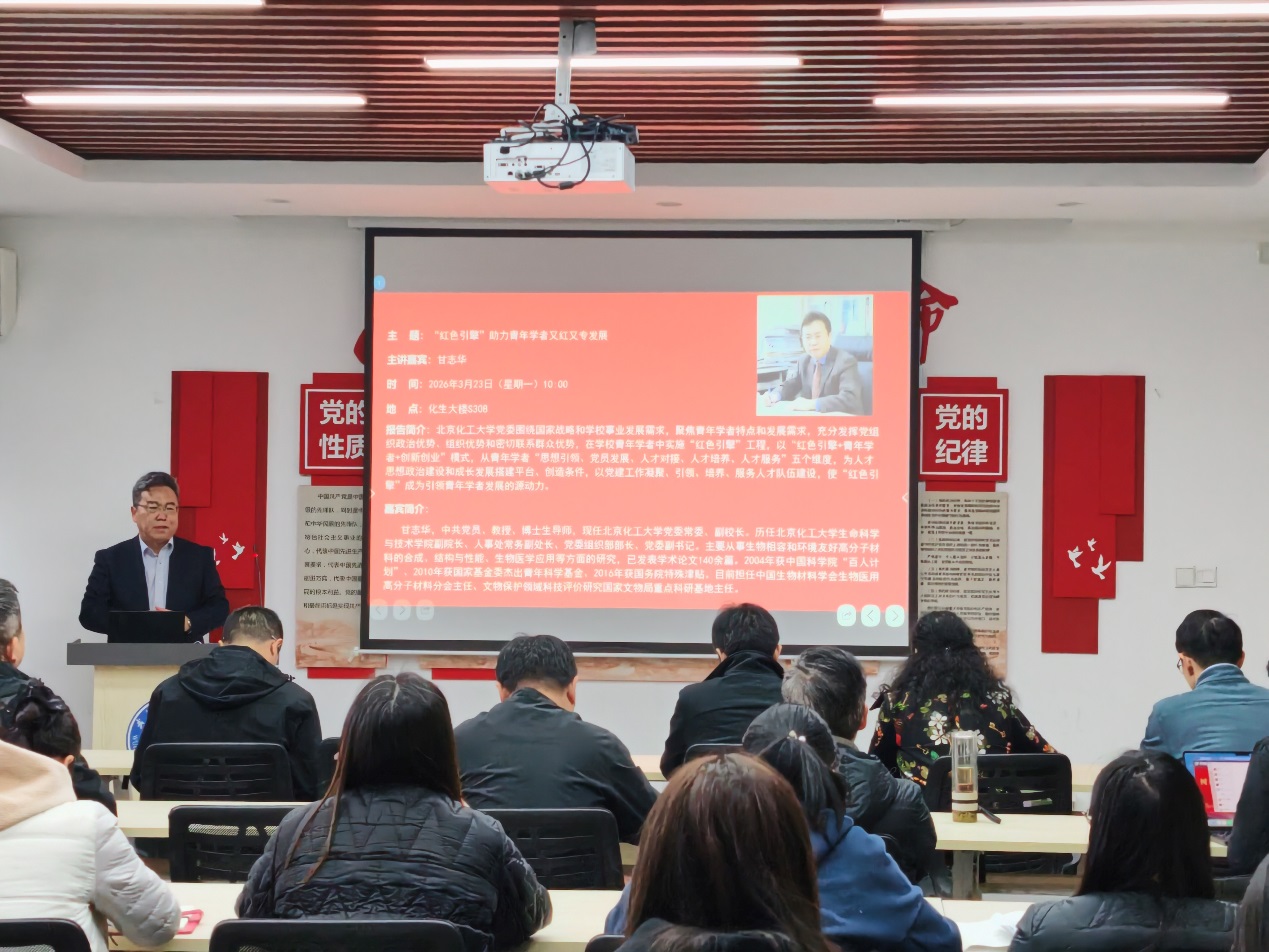 3月23日上午,化生学院(马赛学院)树立和践行正确政绩观学习教育读书班专题报告会在在化生大楼S308举行。北京化工大学党委常委、副校长甘志华教授受邀作“‘红色引擎’助力青年学者又红又专发展”专题报告。学院党委副书记、纪委书记叶楠主持报告会,学院树立和践行正确政绩观学习教育读书班成员、各教工党支部支委及研究生代表参加学习。