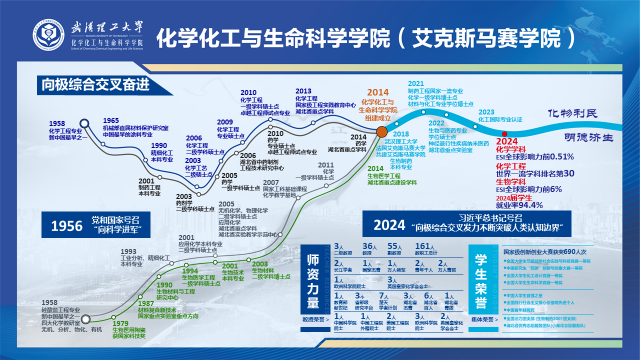 武汉理工大学化学化工与生命科学学院溯源于1958年新中国最早建立的化学工程专业和硅酸盐工程专业的四大化学教研室。2014年组建化学化工与生命科学学院。学院拥有化学一级学科博士点,与材料学院共建材料与化工专业博士点;拥有化学、化学工程与技术、药学等3个一级学科硕士学位授权点,且均为湖北省重点学科;拥有材料与化工、生物与医药两个工程硕士专业学位授权点。2024年化学学科进入ESI全球排名前0.49‰,化学工程学科进入QS世界大学学科排名351-400位,生物学科进入ESI全球排名前6‰。目前在读硕士研究生520余人,本科生1800余人。